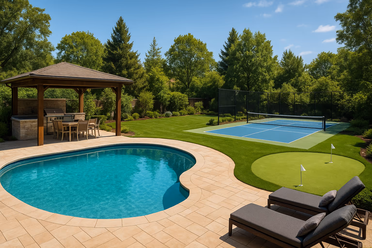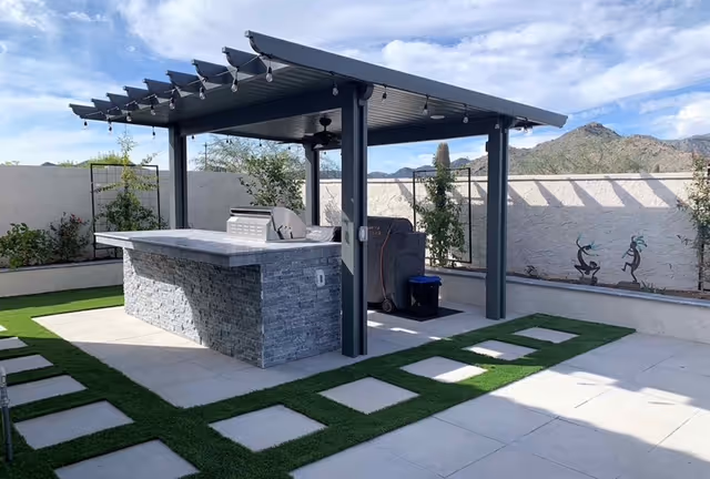 Custom outdoor kitchens, fire pits, BBQ islands, and entertainment areas for year-round enjoyment.